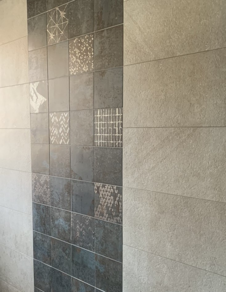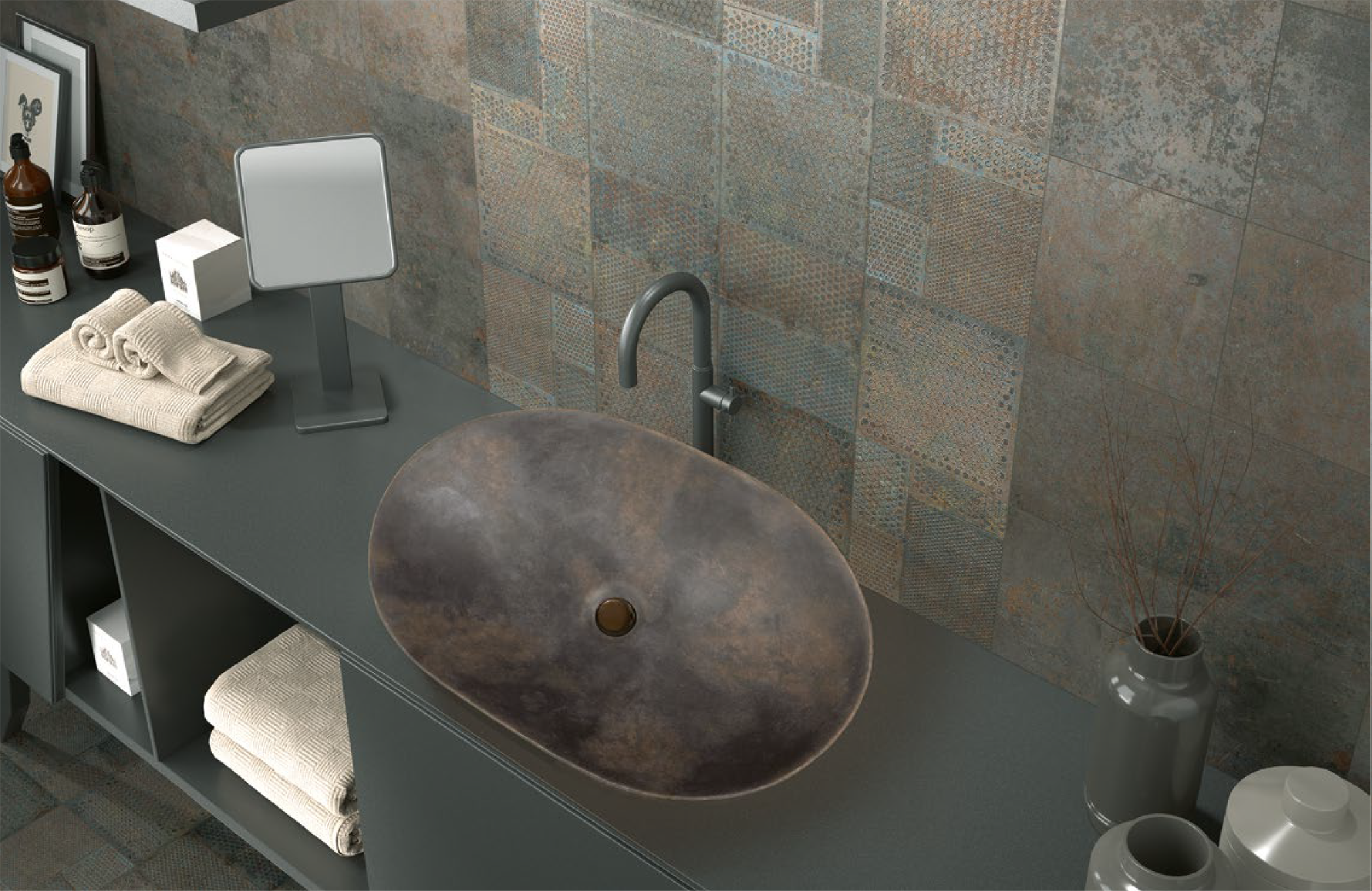 臨摹具有鋪蝕歲月痕跡的金屬質感,斑駁卻簡單乾淨的素磚,泯除氧化生鋪的隱憂、單單保留了純粹的美麗。花磚亮眼又具有